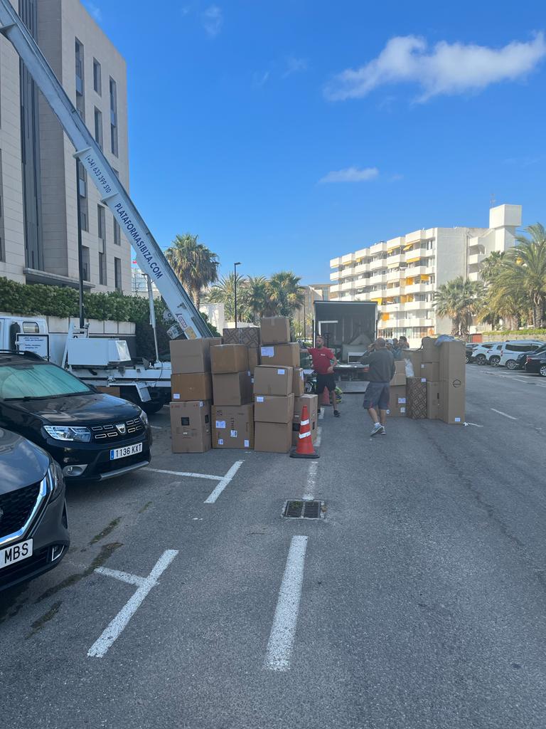 En este trabajo demostramos estos beneficios transportando una gran cantidad de cajas y mobiliario hasta el techo de un edificio de 4 plantas con una de nuestras grúas de mayor tamaño.